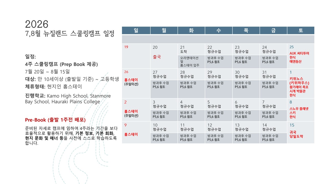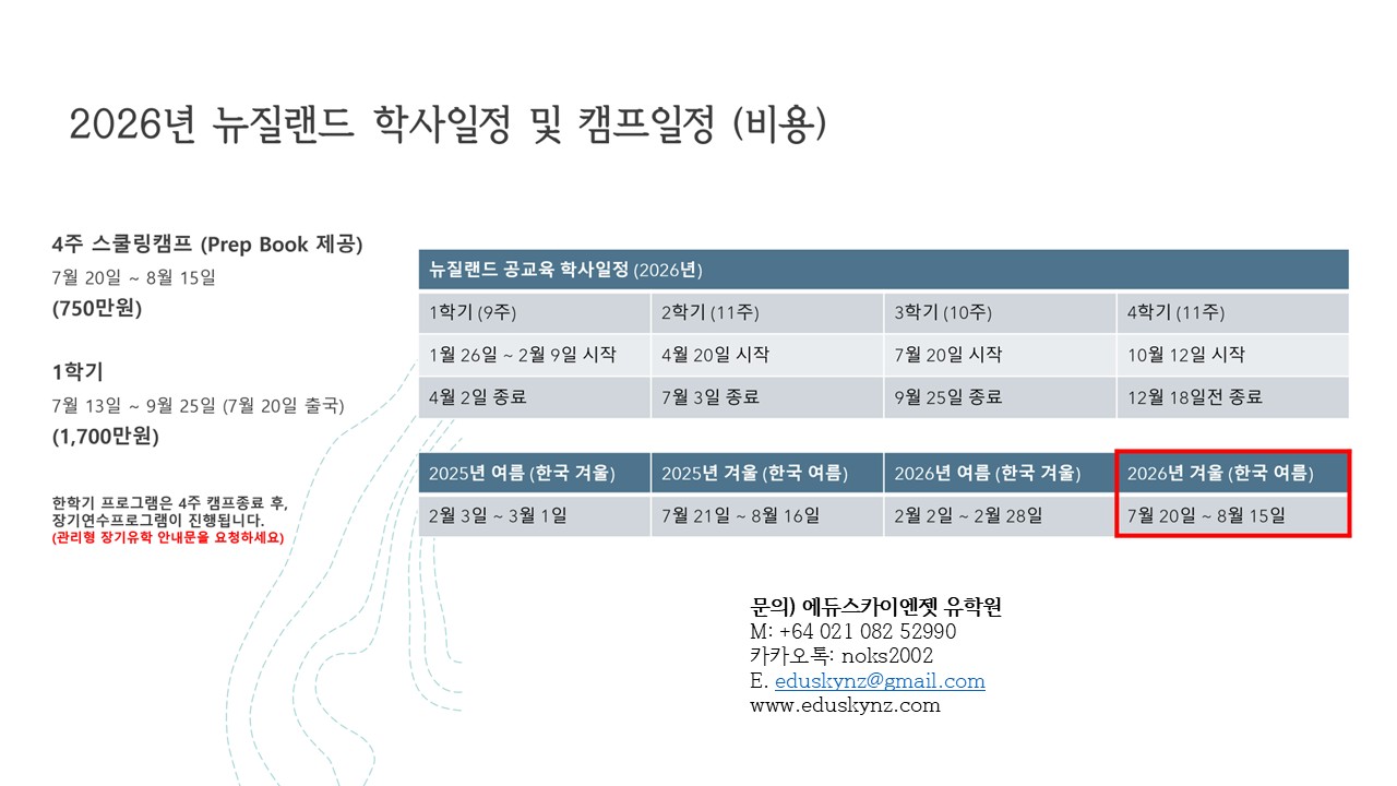 뉴질랜드 공립 IB 인증학교에서 진행되는 진짜 스쿨링 캠프! IB 핵심·영어 몰입·뉴질랜드 문화체험을 한 번에!