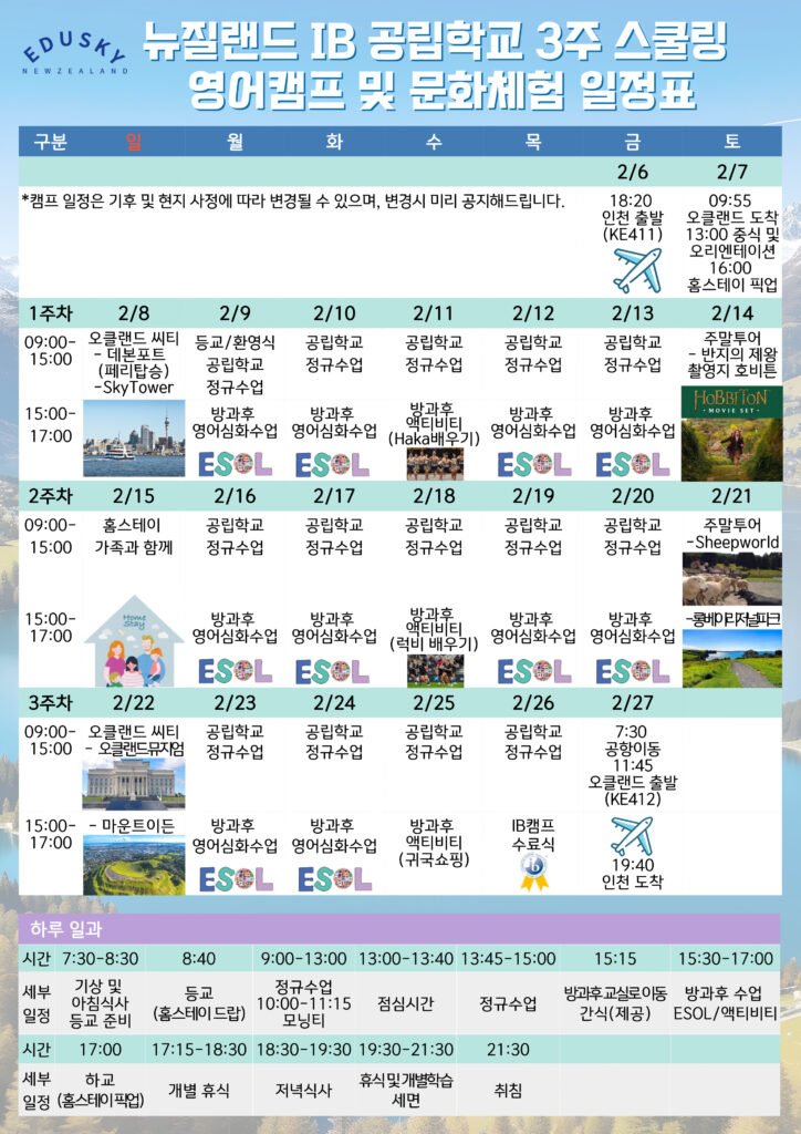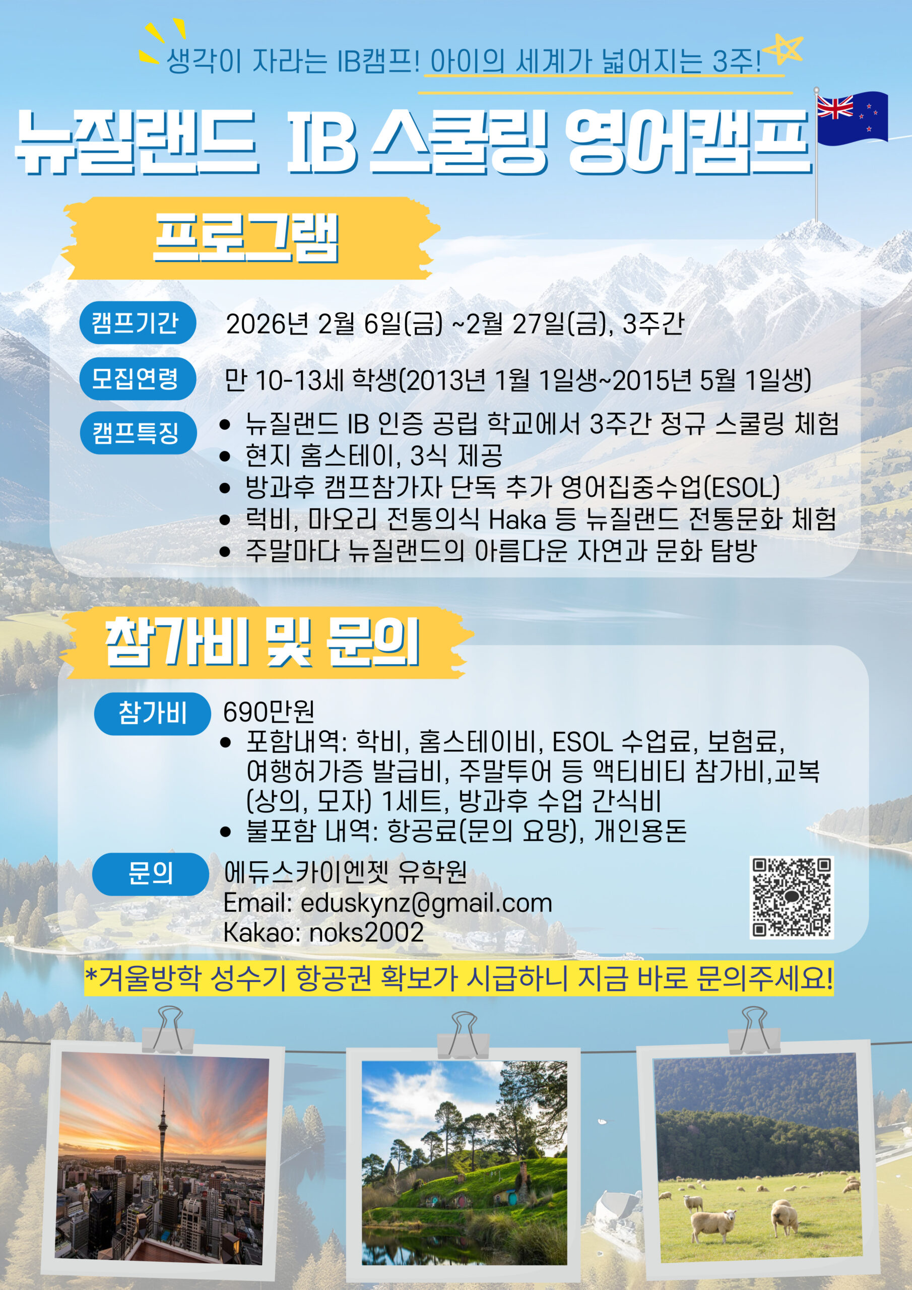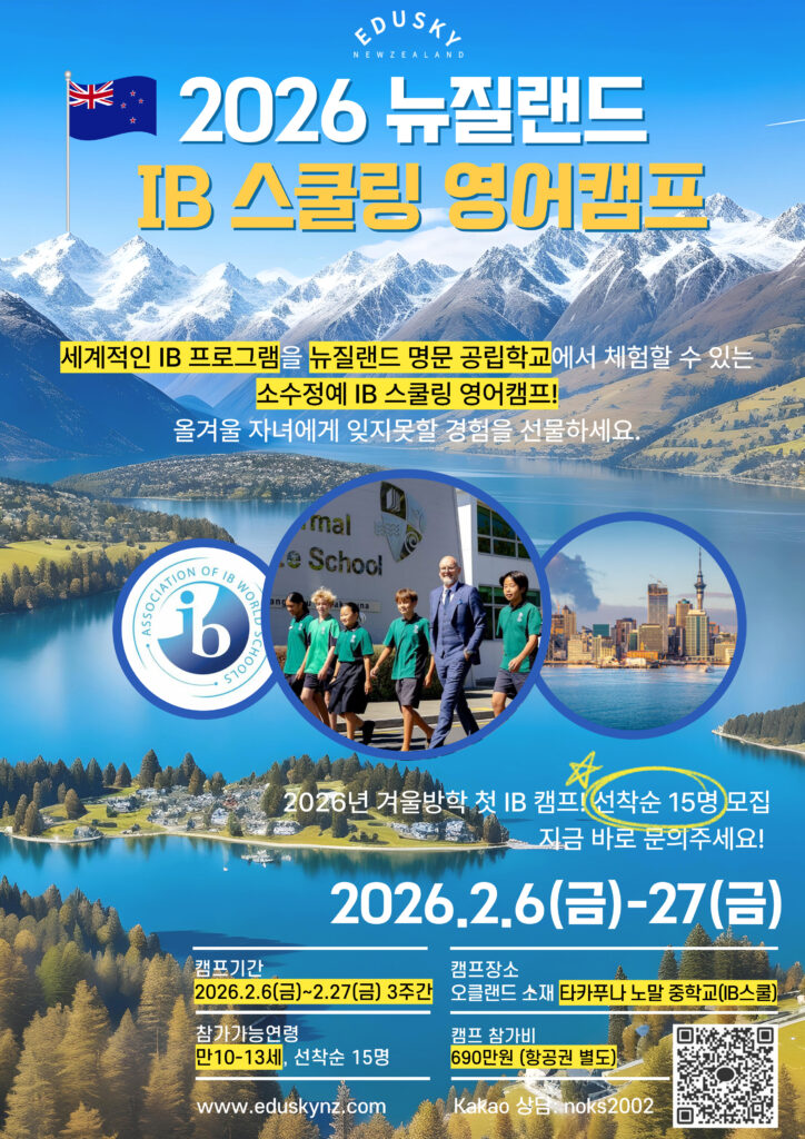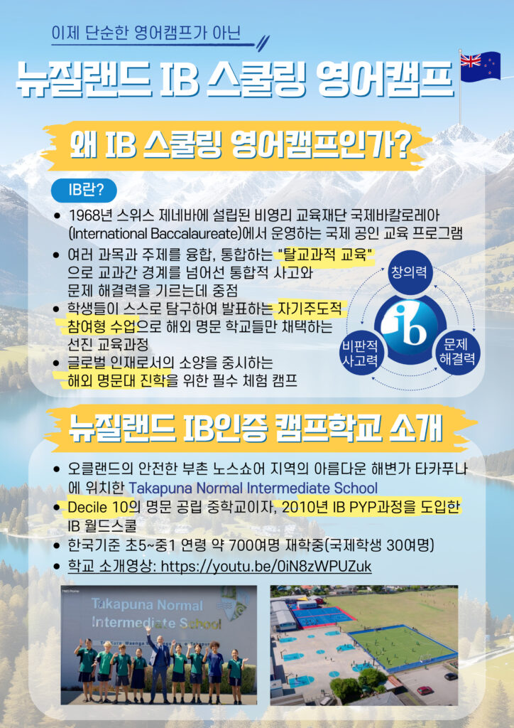 뉴질랜드 공립 IB 인증학교에서 진행되는 진짜 스쿨링 캠프! IB 핵심·영어 몰입·뉴질랜드 문화체험을 한 번에!